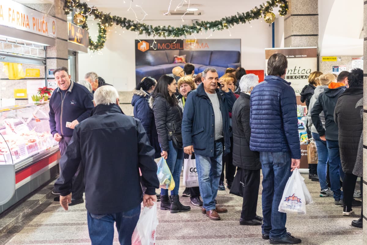 Unatoč kišici koja je od jutros sipila, nervirajući prodavače starina u Ciscuttijevoj koji su čas otkrivali, čaš pokrivali svoje stvari, Badnje je jutro u centru Pule danas bilo živo. Obavljale su se posljednje užurbane kupnje pa su pune ruke posla imali prodavači na zelenoj tržnici, ali i oni u zgradi - mesnice i ribarnica.