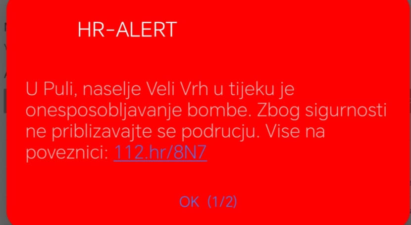 Točno u 8 sati u Puli se danas oglasila prva planirana sirena za uzbunu, najavljujući početak trosatne akcije j pratećih izvanrednih okolnosti vezanih za onesposobljavanje, premještanje i uništavanje zrakoplovne bombe britanske proizvodnje iz Drugog svjetskog rata u naselju Veli Vrh. Ujedno, putem SMS-a i komunikacijskih platformi, građani već oko pola sata dobivaju upozorenja o provođenju akcije.