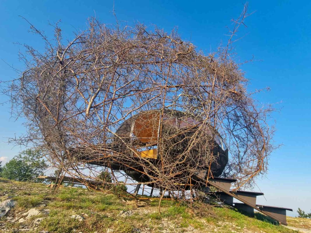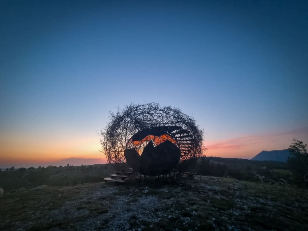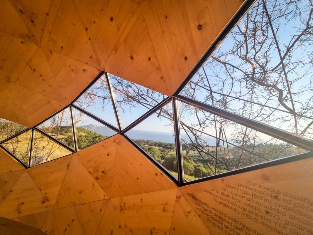 Jedno takvo izuzetno zdanje nedavno je (skoro doslovno) sletjelo i na Učku. Na proplanku nekoliko stotina metara udaljenom od vrha Kremenjak, niknulo je nesvakidašnje planinarsko sklonište i promatračnica za ptice imena - „Izvaljeno jaje u gnijezdu“.