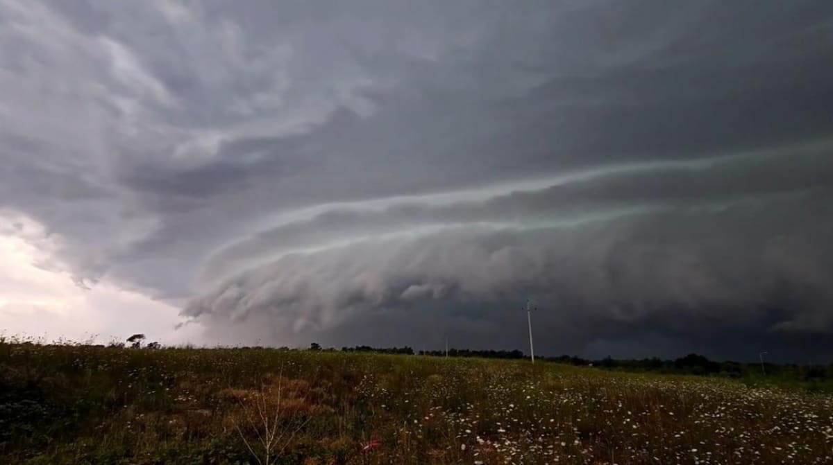 Nebo se zatamnilo, iznad Višnjana pojavio se i "shelf cloud", niski oblak koji se javlja na prednjoj strani grmljavinske oluje: spektakularan je ali je srećom bezopasan jer se iz njega ne razvija tornado.