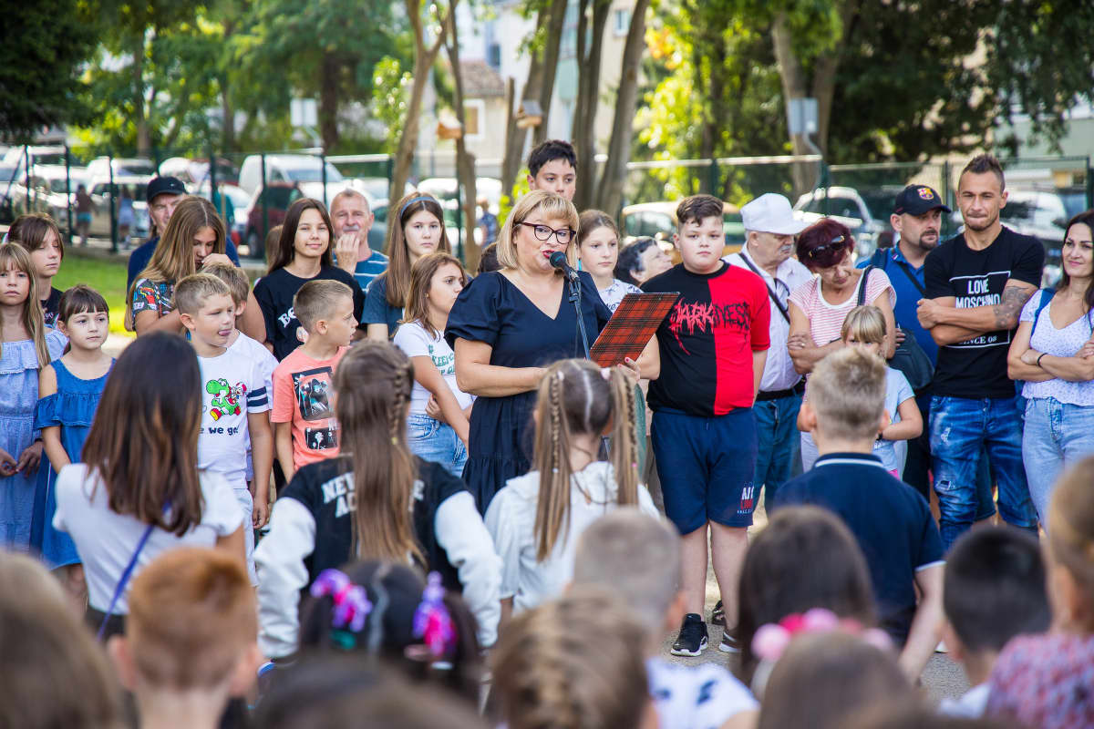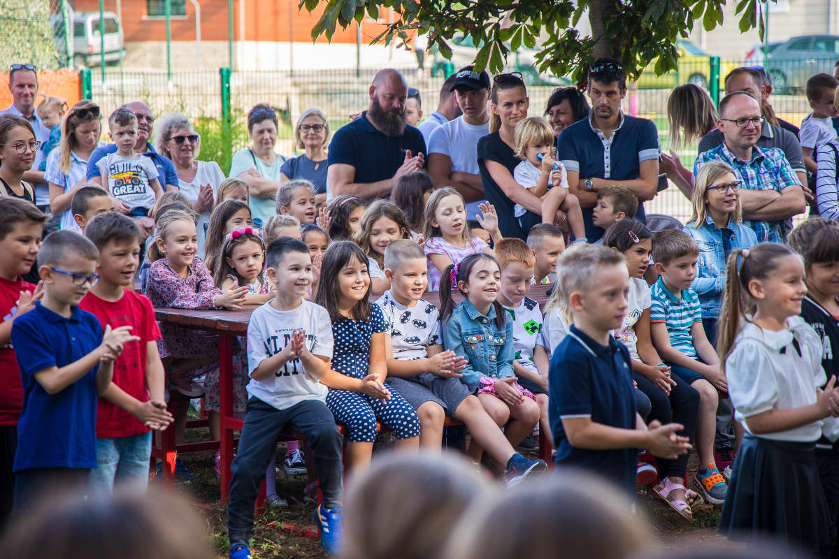 Čini se kako je nekima od učenika prvi dan školske godine pao 'mrvicu' teže nego drugima, pa su odlučili barem još malo produžiti ljeto kroz igru na školskom dvorištu. I roditeljima je prvi dan nove školske godine poseban doživljaj, pa mamama nije bilo teško pridržati "tešku" školsku torbu.