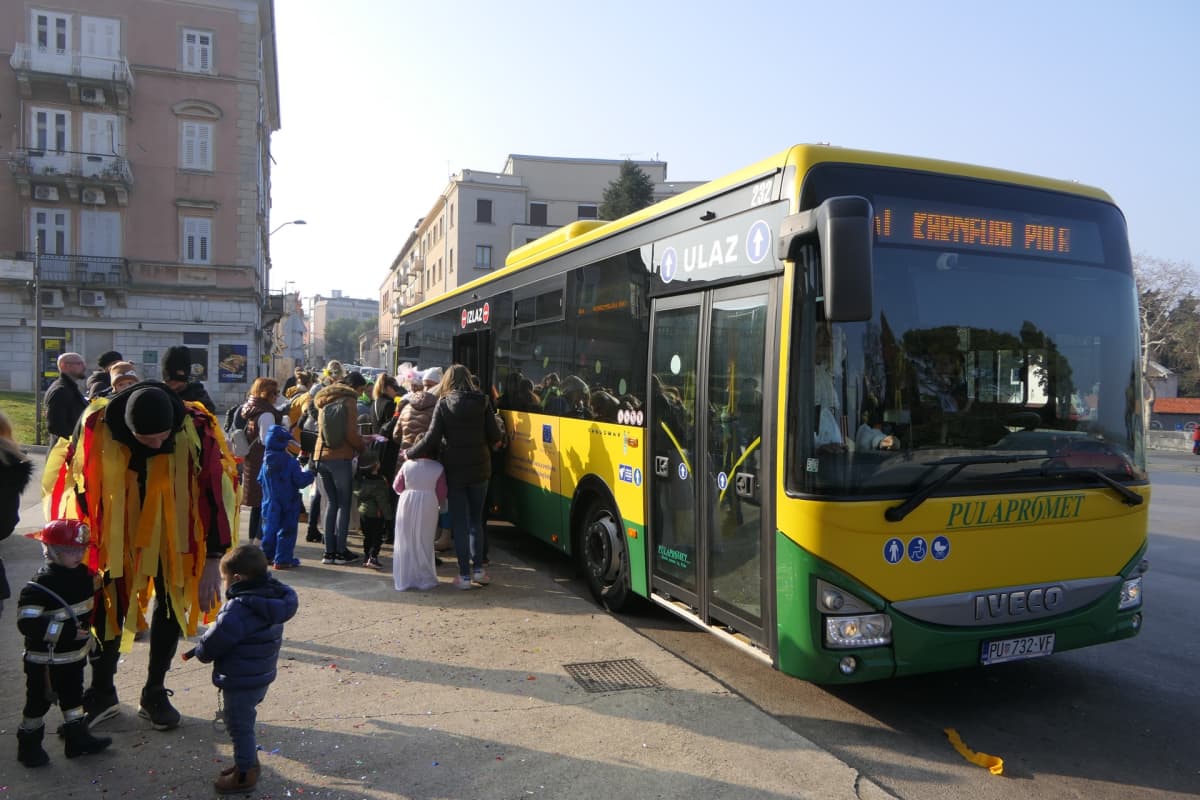 Današnji maškarani put počeli smo pratiti ispred Arene, tu se je već skupila zavidna gomila onih koji čekaju autobus Pulaprometa koji ih vodi u čaroliju karnevala, uz veliki pomoć pulske udruge Birikina čiji su članovi uveselili cijelo događanje.