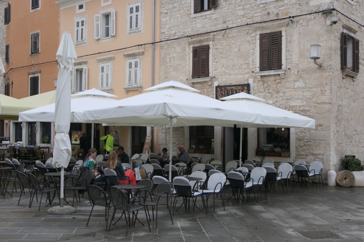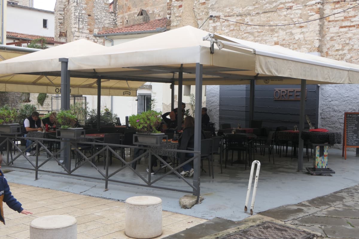 Na pulskom Forumu radi nekoliko terasa, par gostiju na svakoj od njih i poneki turisti u razgledavanju.