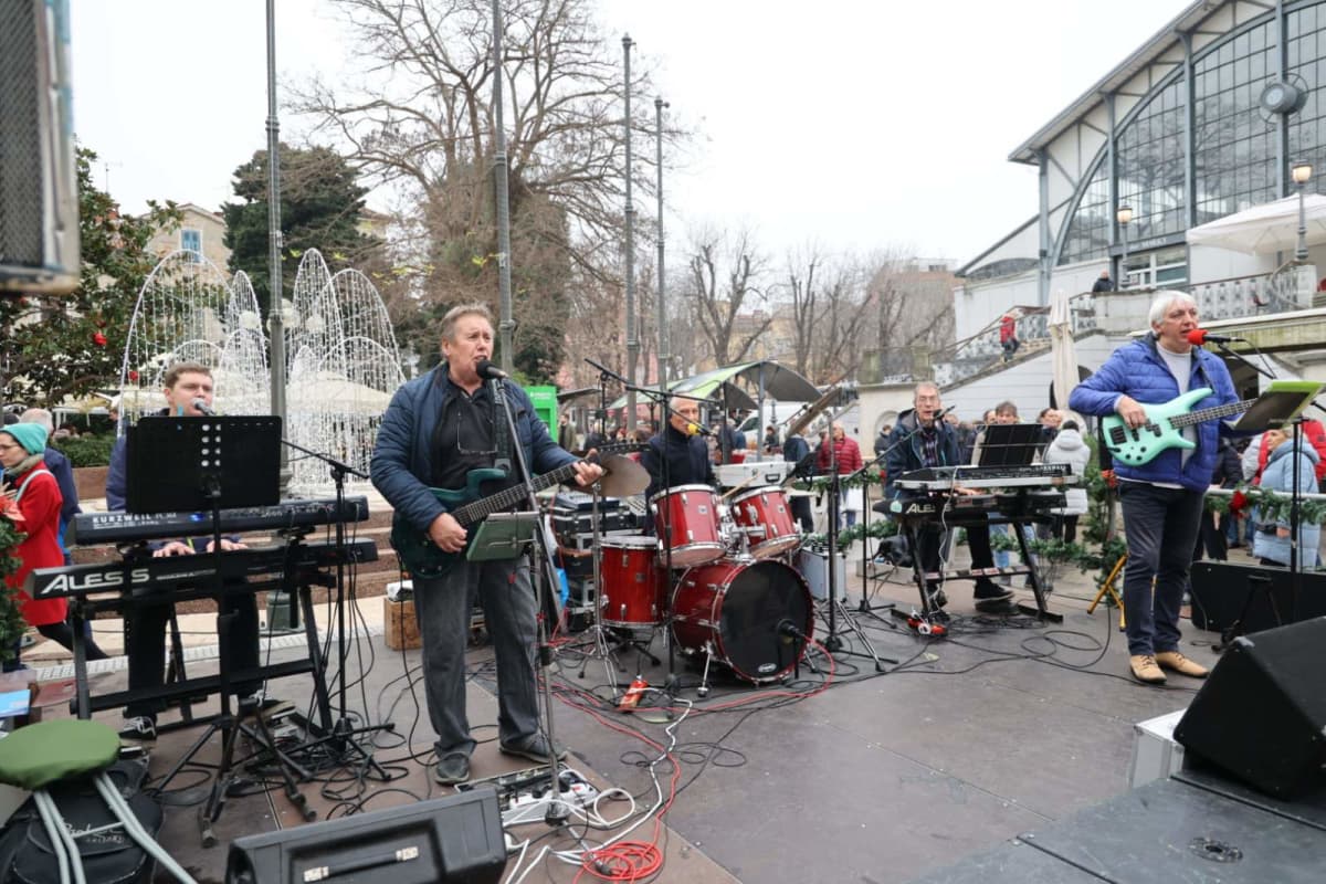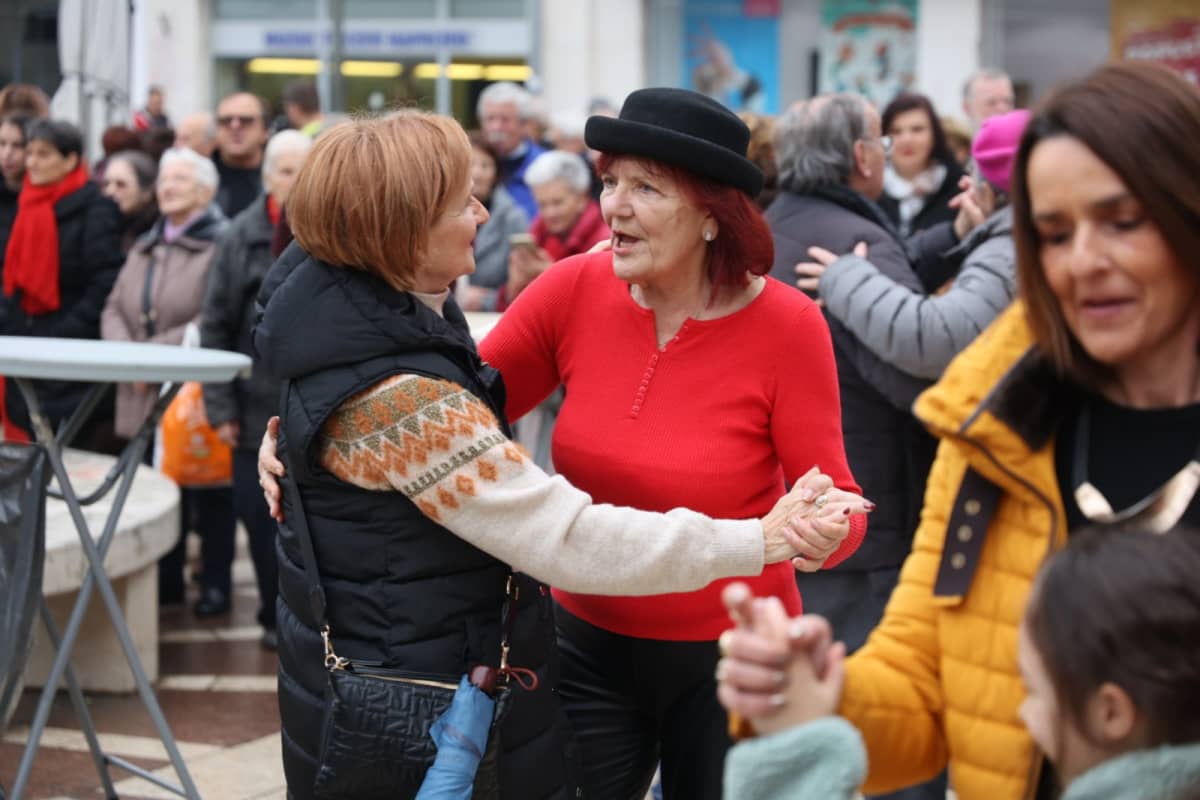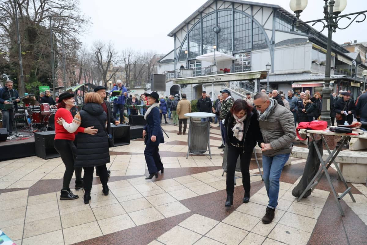 Još od jutra na pulskoj tržnici vlada odlično raspoloženje. U zadnjem danu godine, na trgu kod vodoskoka okupio se veći broj građana koji se druže i plešu uz glazbu Anelida i Vesna Nežić Ružić.