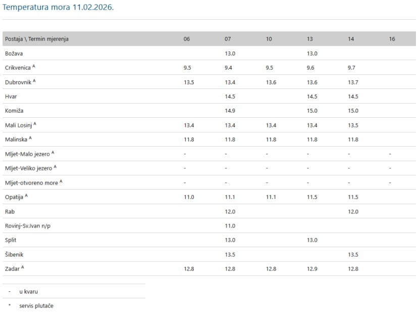 "Mjerenja temperature mora na lokaciji Pula trenutačno se ne provode, zbog čega podaci nisu dostupni te se ne prikazuju na popisu lokacija. Razlog je spriječenost motritelja u obavljanju mjerenja. Nastavak mjerenja i ponovna javna dostupnost podataka očekuju se najkasnije krajem veljače", odgovorili su nam iz DHMZ-a.