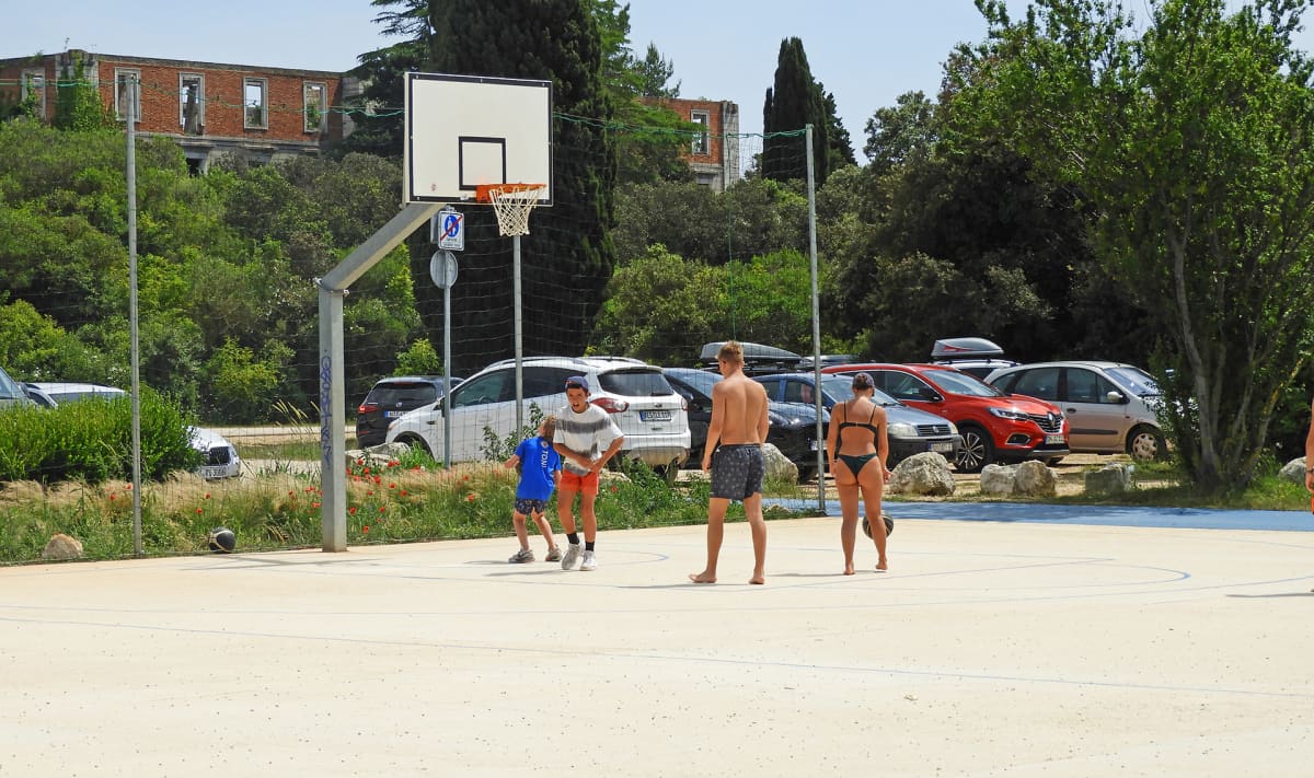 Skate park napravljen prije dvije godine, za što je Grad Pula platio ondašnjih 2,1 milijuna kuna, nije često posjećen, djeci i mladima koji bi ga rado koristili je dosta daleko, pa tako i tijekom našeg obilaska zjapi prazan, dok na obližnjem košarkaškom terenu obitelj iz Njemačke igra košarku.