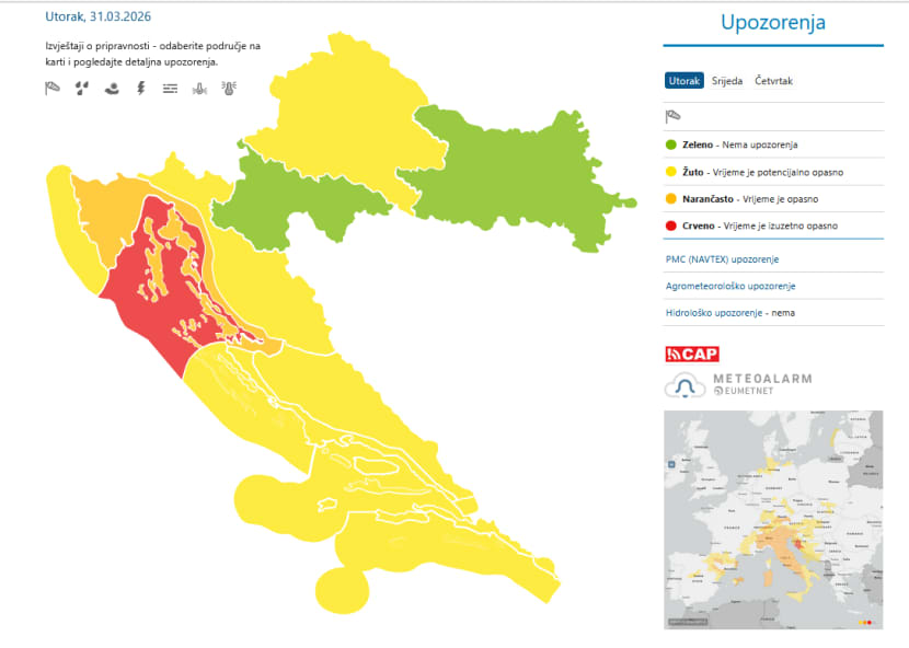 NE vjetar 14-28, mjestimice do 34, a podno Velebita i do 40 čvorova, poslijepodne u jačanju na 16-34, mjestimice do 38, a podno Velebita i do 48 čvorova. More 3-4, na otvorenom moguće 5. Vidljivost 10-20 km. Pretežno oblačno, mjestimice kiša, mogući su pljuskovi s grmljavinom, osobito na jugu područja.