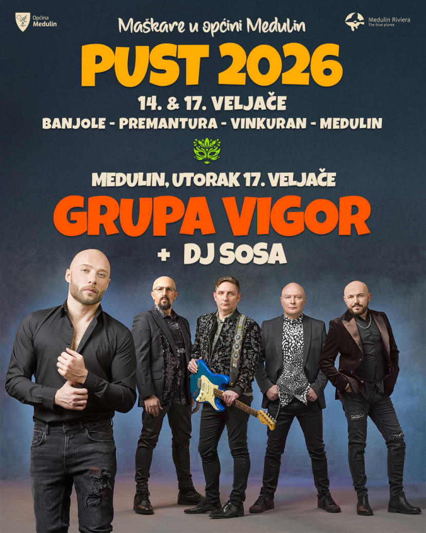 Bit će to odlično zagrijavanje za ono što slijedi na Pusni utorak, 17.02. kada će u Medulinu od jutra krenuti velika maškarana povorka, zabava na Placi uz DJ Sosu od 18 sati, a tradicionalno spaljivanje Pusta također na Placi u 20 sati. Slijedi besplatan koncert grupe Vigor uz DJ Sosu na Medulinskoj rivi, u šatoru pored Malina na vitar od 21 do ranih jutarnjih sati.