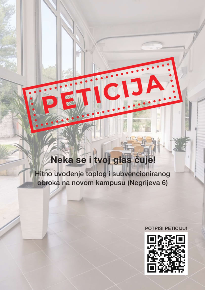 Peticijom Studentski zbor traži uvođenje toplog obroka na kampusu bivše Mornaričke bolnice, omogućavanje subvencionirane prehrane putem studentske X-ice te pravovremeno i ozbiljno rješavanje problema od strane Studentskog centra i nadležnih institucija.