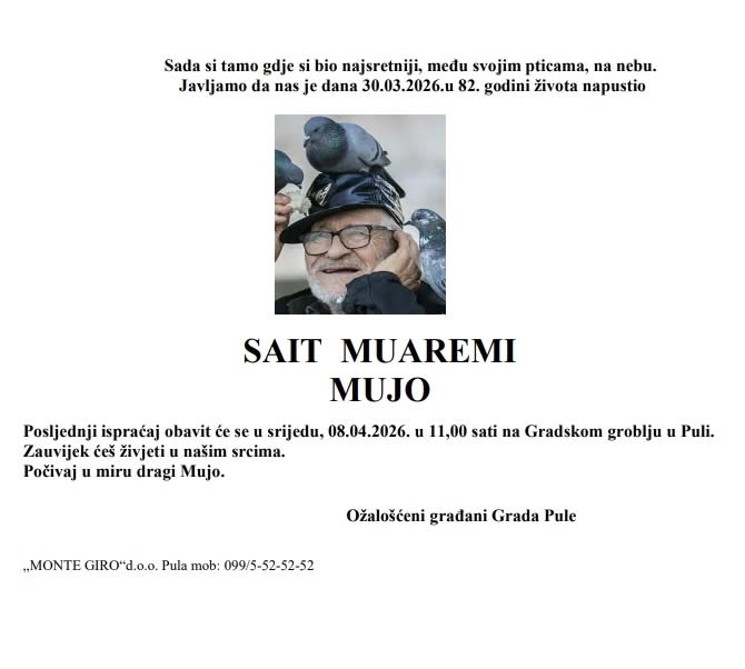 Kako doznajemo, Mujo će biti sahranjen na Gradskom groblju Pula u srijedu, 8. travnja u 11 sati.