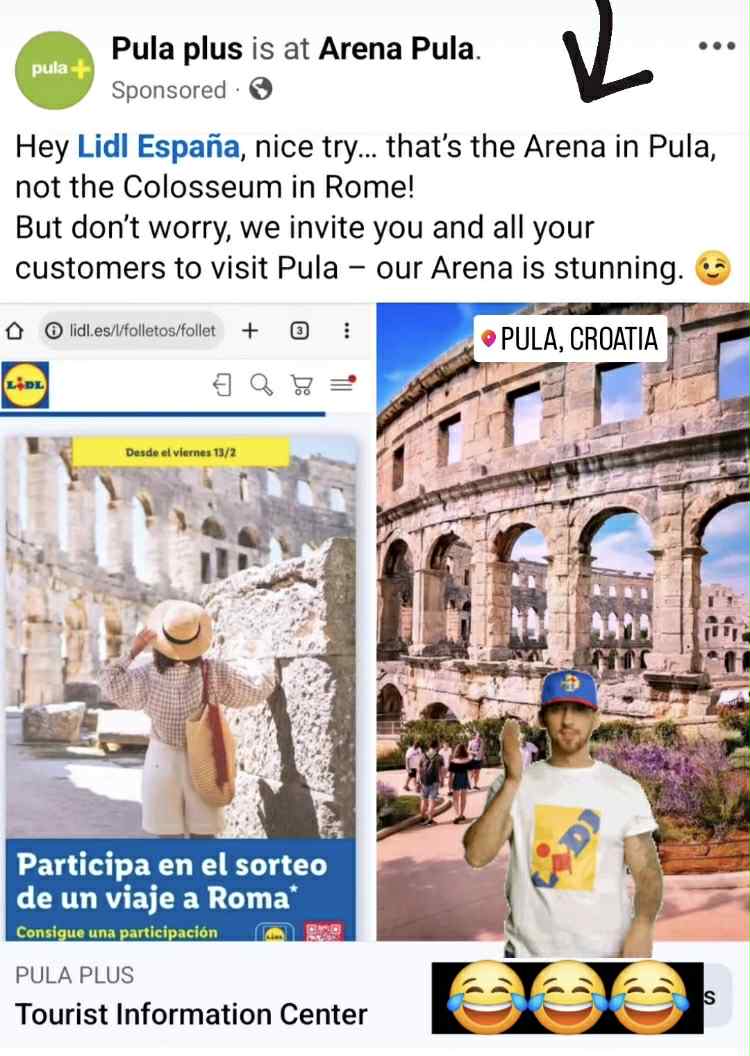 "Hej Lidl Španjolska, dobar pokušaj. Ovo je Arena u Puli, a ne Koloseum u Rimu. Ali ne brinite, pozivamo vas i vaše kupce da posjetite Pulu - naša Arena je doista predivna.