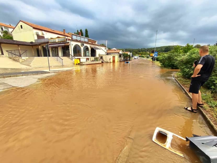 U gradiću na zapadnoj obali Istre parkiralište i ceste kod crpke za gorivo bile su pogodnije za prometovanje plovilima nego vozilima na četiri kotača * Tuča u slovenskom Krasu, kiša i jak vjetar u Trstu