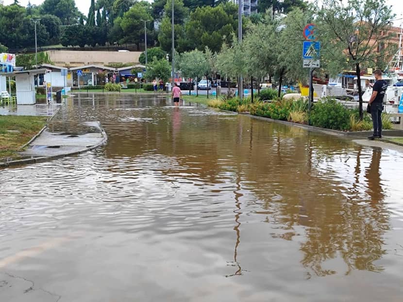 U gradiću na zapadnoj obali Istre uslijed kiše poplavljeno jugoistočno područje luke, a parkiralište i ceste kod crpke za gorivo bile su pogodnije za prometovanje plovilima nego vozilima na četiri kotača.