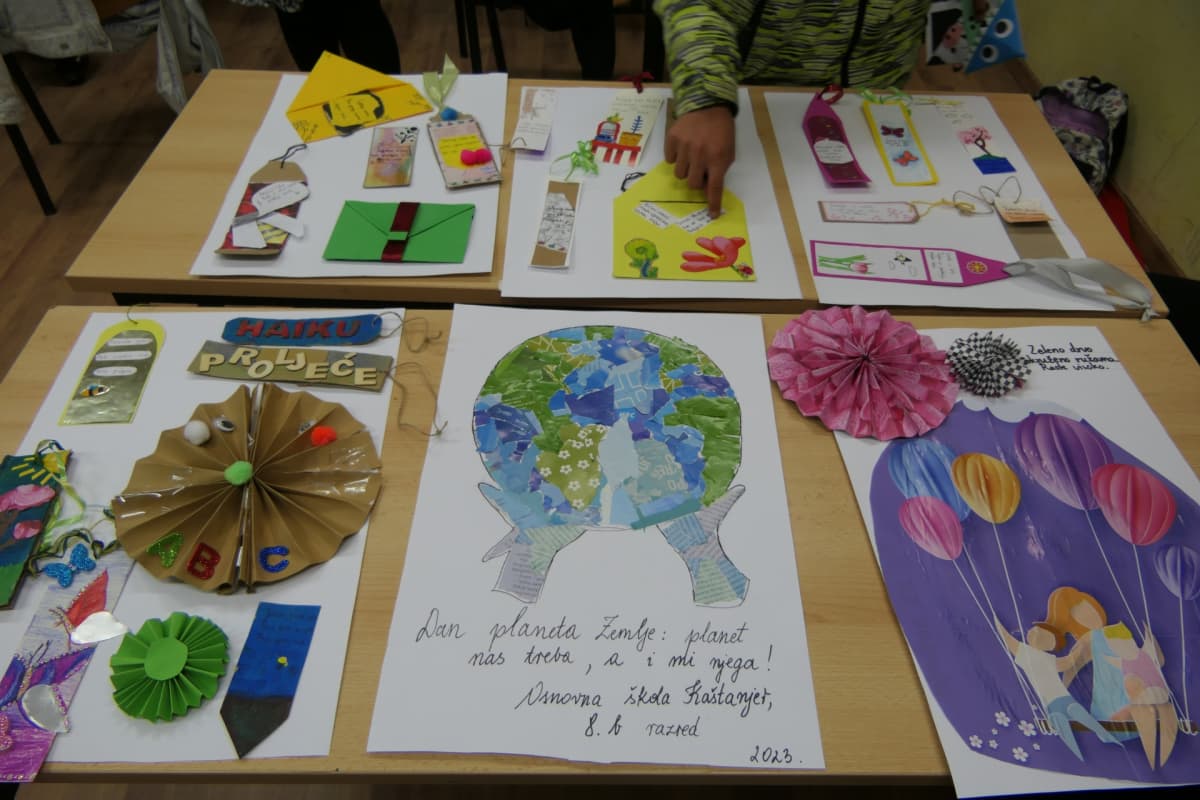 - Mi smo danas pisali haiku pjesme na temu proljeća. Haiku su kratke pjesme koje opisuju ovu temu, a izrađivali smo bookmarkere, kuverte, te plakate na temu Dana planete Zemlje i cvjetove od kolaž papira. Pošto nam je razrednica učiteljica hrvatskog jezika, spojili smo Dan planete proljeće u jedno, ispričala nam je Carlina prijateljica Marta.