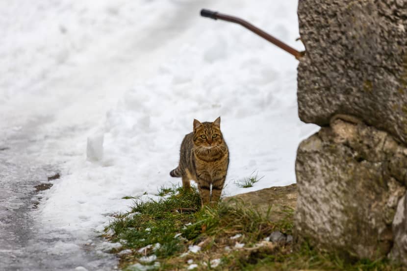 Tišina ovdje para uši, a oči pasu ljepotu krajolika. U Jelovicama mačke lutalice strpljivo čekaju da prođe studen. Ima ih na svakom uglu. Gledaju nas poprijeko, nemaju povjerenja. Ali osim nas na uličicama nema ni psa - što je za njih svakako dobra vijest - pa ih povremeno obuzme znatiželja te odluče pratiti naš korak. No, brzo i odustanu, draže im je skloniti se na nekom toplom mjestu.