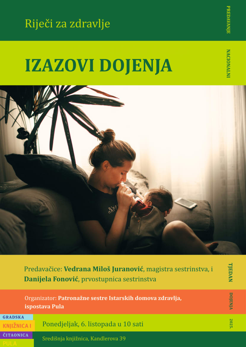 Nacionalni tjedan dojenja, koji se obilježava u prvom tjednu listopada, bit će obilježen u ponedjeljak predavanjem o izazovima dojenja koje će održati Vedrana Miloš Juranović, magistra sestrinstva, i Danijela Fonović, prvostupnica sestrinstva, u dvorani Gradske knjižnice i čitaonice Pula.