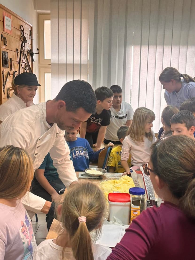 U radionicama koje je vodio poznati chef Gianpaolo Sardot sudjelovali su učenici od 1. do 4. razreda. Aktivnost je započela kratkom anketom u kojoj su učenici navodili koja jela najviše vole pripremati, a potom su, uz pomoć učiteljica i školskog osoblja, izrađivali domaće krokete od krumpira, koji će se moći uvrstiti i u školski meni. Edukativnom dijelu pridružile su se i vrijedne djelatnice škole Ljupka Matić, Branka Rioža i Davorka Rosić, čime je dodatno osnažena veza između škole i lokalne gastronomske tradicije. Poseban trenutak radionice bio je uručenje donacije od 1.000 eura ravnatelju škole, Predragu Brkiću – sredstva su prikupljena tijekom ovogodišnje Gramperijade, popularne manifestacije posvećene upravo krumpiru.