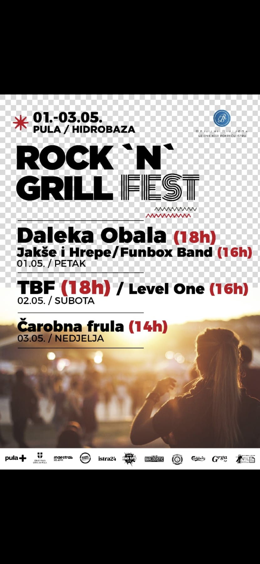 Povodom obilježavanja Dana grada Pule i Praznika rada, od 1. do 3. svibnja na Hidrobazi vraća se Rock 'n' Grill Fest – tri dana opuštenog druženja uz more, u ritmu dobre glazbe, mirisa roštilja i proljetnog sunca. Program je osmišljen u dnevnim i popodnevnim satima, idealno za uživanje na otvorenom. Ulaz je besplatan!