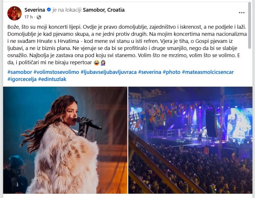 “Ne vjeruje se da bi se profitiralo i druge smanjilo, nego da bi se slabije osnažilo. Najbolja je zastava ona pod koju svi stanemo. Volim što ne mrzimo, volim što se volimo. E da, i političari mi ne biraju repertoar”, zaključila je Severina.