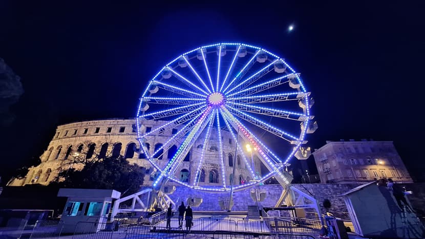 Krećemo prema najnovijoj adventskoj atrakciji, onoj na Karolini. Panoramski kotač – Pula Eye, koja je 'friško' zaživjela, nakon što je zbog mnoštva kritika usmjerenih na sigurnost lokacije na rivi, koje more podlokava, hitro prebačena podno Arene. Za našeg boravka od pola sata, nekoliko gostiju odlučilo je krenuti na ovaj vrtuljak. Majka sa sinom koja je završila s vožnjom, kaže nam da se njoj baš i nije dopala vožnja, dok je sin uživao, kaže i poručuje da je cijena za odrasle osam, a za djecu šest eura.