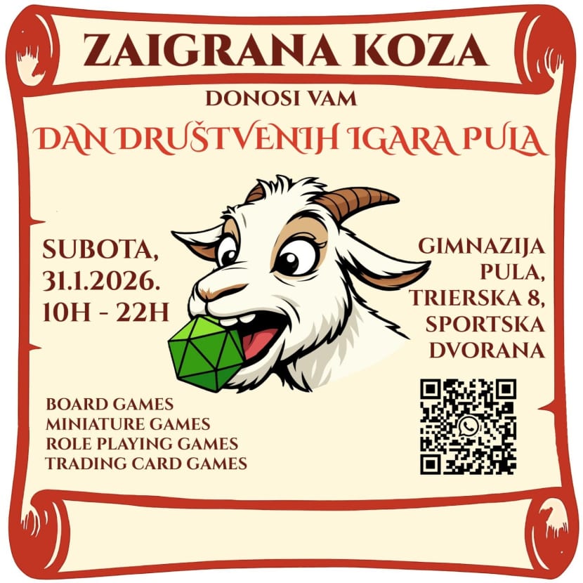 Sutra, u subotu 31. siječnja u sportskoj dvorani Gimnazije Pula održat će se event pod nazivom „Dan društvenih igara“ u organizaciji udruge „Zaigrana Koza“.