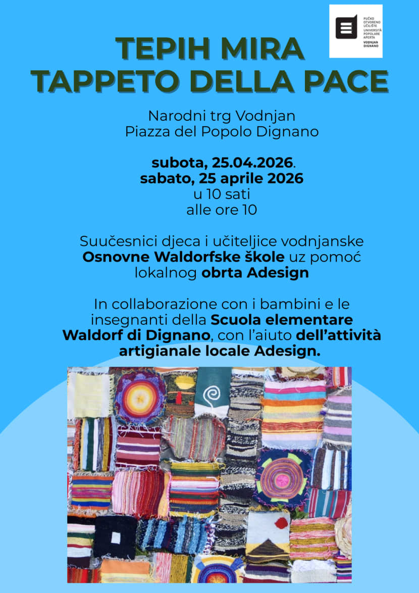 Uz brojne destinacije, ove subote, 25. travnja 2026. u 10 sati, Tepih mira dolazi u Vodnjan. Inicijatori ovog projekta, konceptualni umjetnici iz Njemačke Martha i Markus, slagat će tkane komade tkanina prikupljene iz svih krajeva svijeta u jedan veliki „Tepih mira" na Narodnom trgu u Vodnjanu.