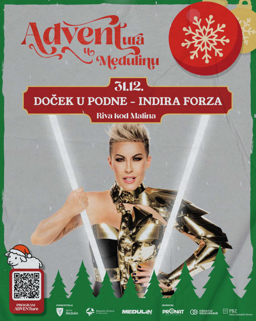 Točno u 12 sati, Medulin ulazi u Novu godinu uz glazbeni spektakl i snažnu energiju Indire Forza koja će svojim hitovima i karizmatičnim nastupom medulinsku rivu pretvoriti u veliku plesnu pozornicu!