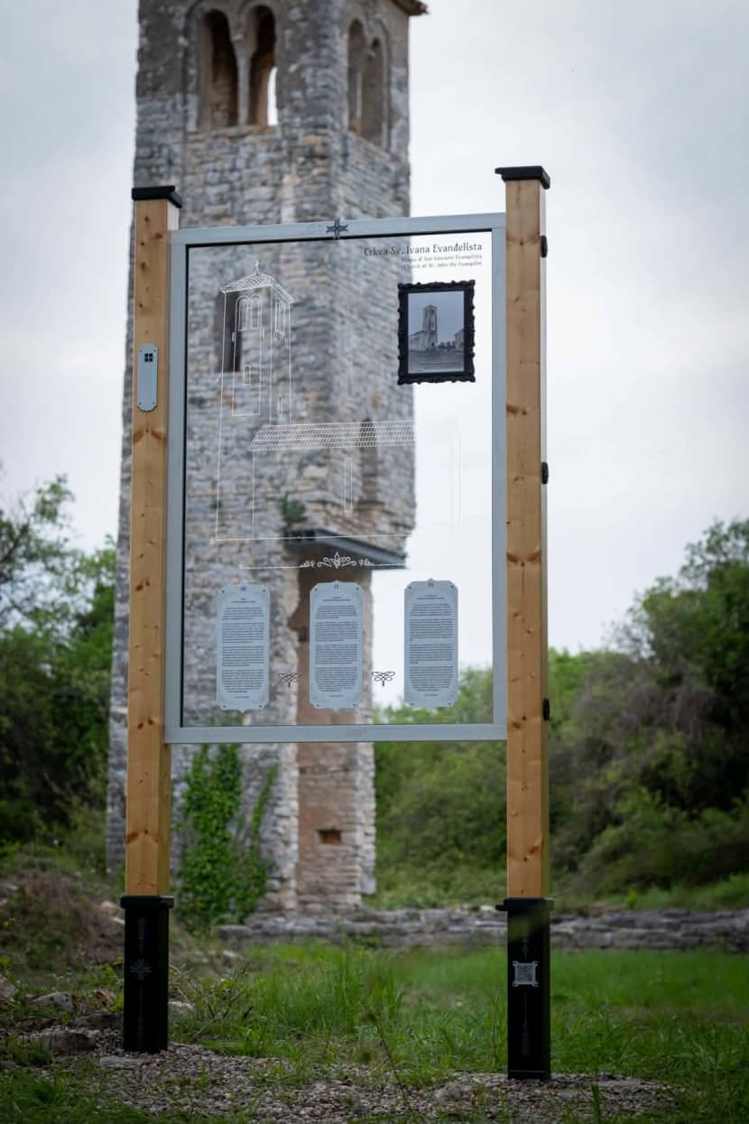 Osim osnovnih informacija o samom lokalitetu, ploča je osmišljena na poseban, interaktivan način – gledajući kroz nju i istovremeno promatrajući ostatke crkve, posjetitelji mogu dobiti dojam kako je ova građevina nekada izgledala, odnosno vizualizirati njezine nekadašnje konture.