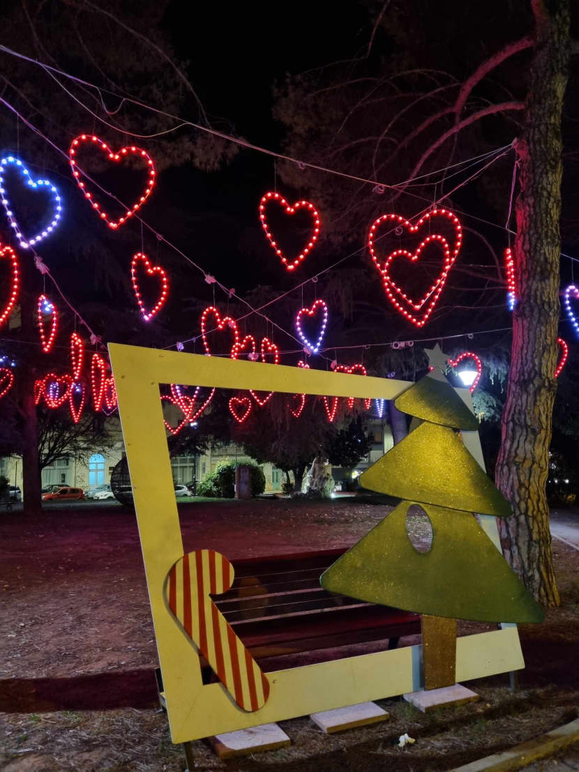 Poglede privlači posljednjih dana i park Petra Krešimira IV, preko puta Porezne, koji je ukrašen brojnim svjetlećim srcima koja mijenjaju boje od bijele do crvene. Želite li snimiti najljepšu božićnu čestitku, ovo je pravo mjesto - pored klupice postavljen je okvir i savršena scenografija