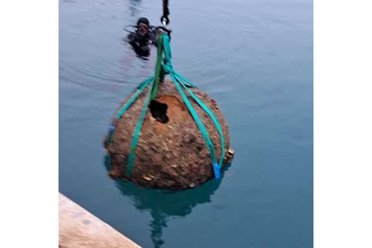Protueksplozijski ronioci pulske i karlovačke Interventne jedinice policije minu su podigli uz pomoć balona na morsku površinu, a potom su je stavili u tegalj i plovilom transportirali do mola Delfin u Rovinju odakle je prebačena dalje za uništenje