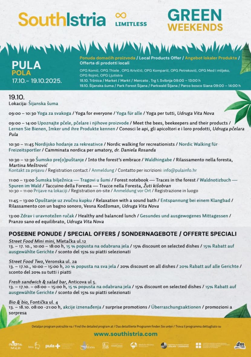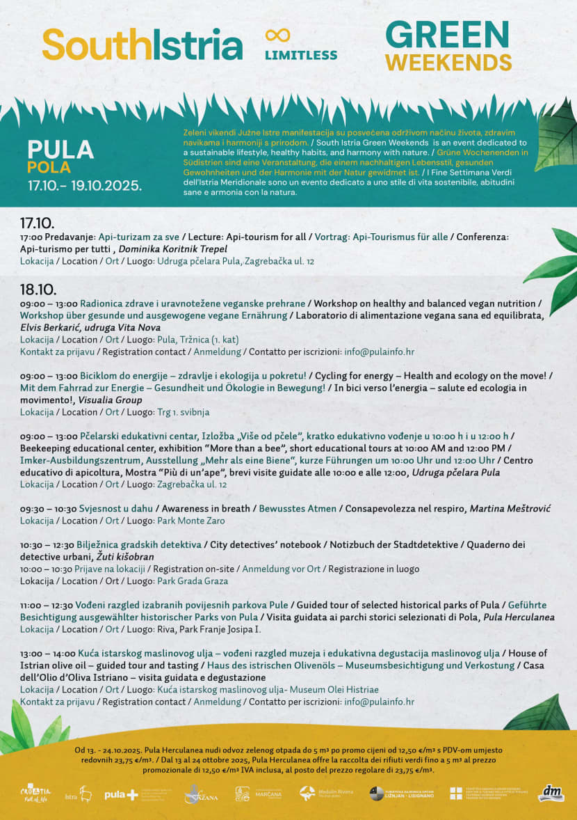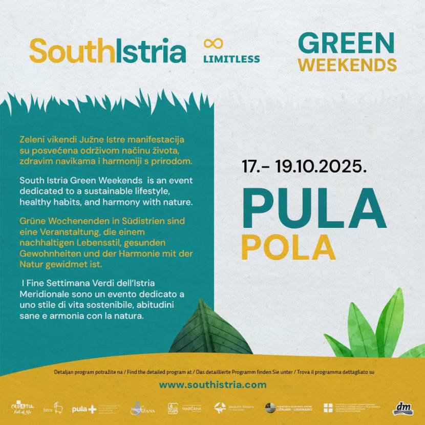 Pula ovoga će listopada biti domaćin manifestacije „Zeleni vikendi južne Istre“, trodnevnog programa koji promovira održivi način života, zdravlje i povezanost s prirodom. Događanje, koje se održava od 17. do 19. listopada, okupit će brojne sudionike, predavače i lokalne proizvođače kroz niz radionica, predavanja, rekreativnih aktivnosti i degustacija.