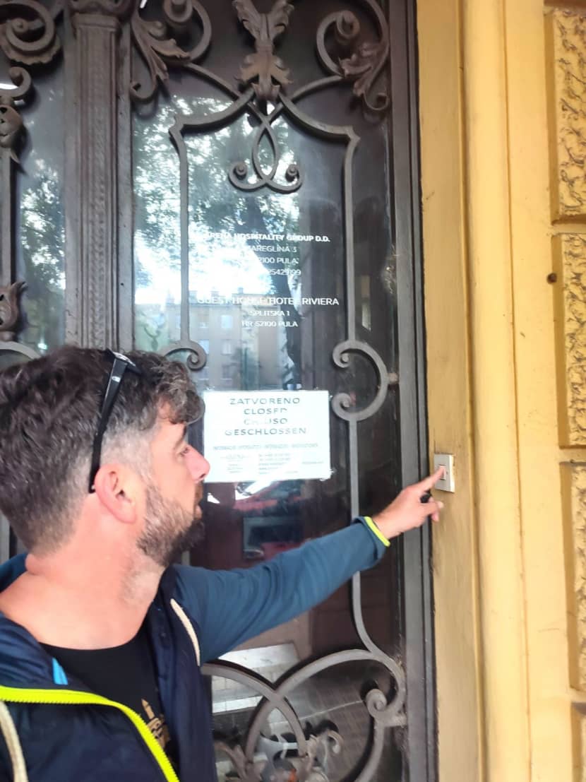 Već prilazeći hotelu Riviera okolni nam stanar, pulski nogometni trener i nekadašnji nogometaš, dok premješta ispred glavnog hotelskog ulaza svoj automobil, kaže da su prve skele na prednjoj i zadnjoj strani hotela postavljene koncem prošlog tjedna i da se baš nadao da će danas nastaviti radove. Baš bi, kaže, želio da se taj lijepi hotel bogate prošlosti obnovi čim prije.